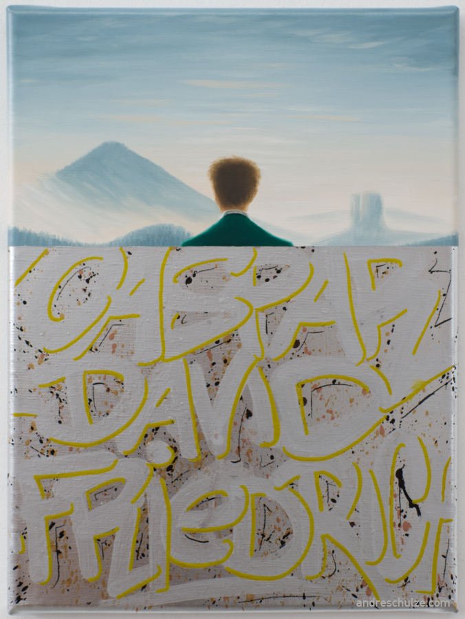 Die Beschäftigung mit Caspar David Friedrich folgt einer intensiven Auseinandersetzung mit dem Romantikern. Inspiriert durch Museumsbesuche im Albertinum Dresden, entstand der Wunsch des Künstlers, hinter das Geheimnis dieser imposanten und berührenden Gemälde zu gelangen und die Gemälde zeitgenössisch zu interpretieren. In mehreren Versionen tastet sich der Künstler an die Kunst Caspar-David Friedrichs heran um etwas neues daraus zu kreieren und die Gemälde mit unserer heutigen Zeit zu verbinden.