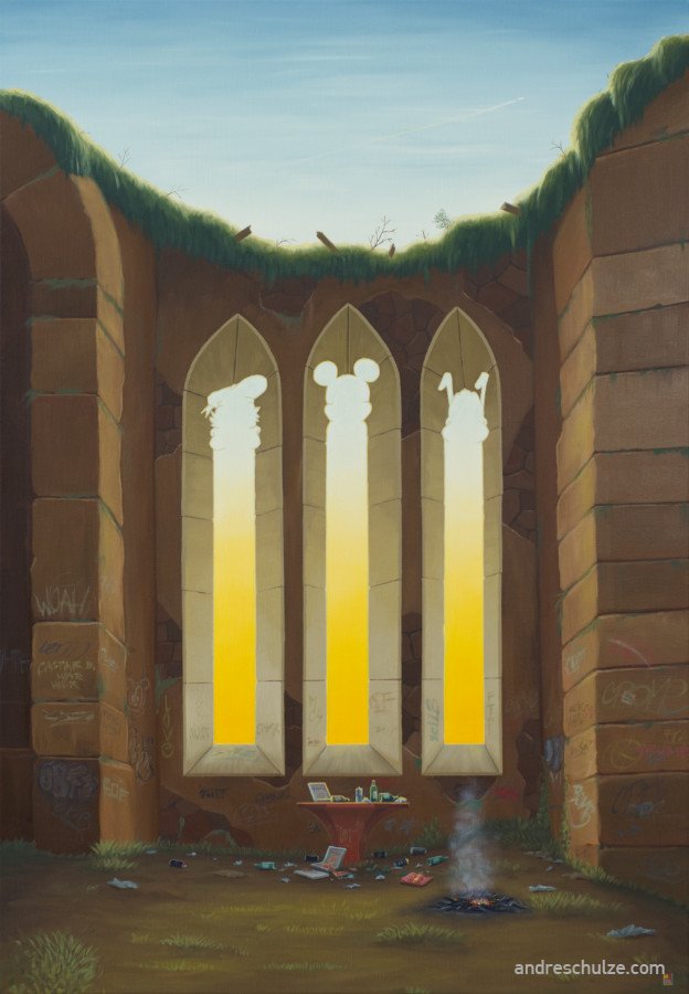 André Schulzes aktuelle Bilder überzeugen durch die gelungene Verbindung von präziser Malerei und der Lust an feinsinnigen Bildmotiven. In der Nahsicht offenbaren sich humorvolle Details, die in ihrem Zusammenwirken neue, interessante Geschichten erzählen. Der Künstler verzichtet auf die Gestaltung der Hintergründe und verleiht so dem Darstellungsgegenstand zusätzlich einen nahezu emblematischen Charakter – architektonische Artefakte aus dem vergangenen Jahrhundert schweben wie urbane Solitäre vor monochromen Flächen und vermögen exemplarisch die Veränderung unserer Stadtlandschaften und alltäglichen Umgebung ins Bewusstsein zu rufen.